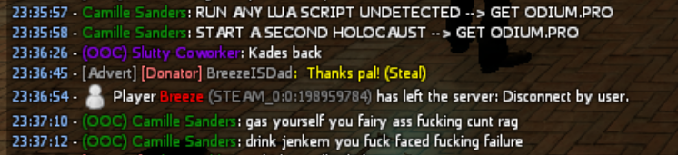 Odd the guy was spamming using cheats and changed his name every time i votekicked him Kade STEAM_0:1:44417622