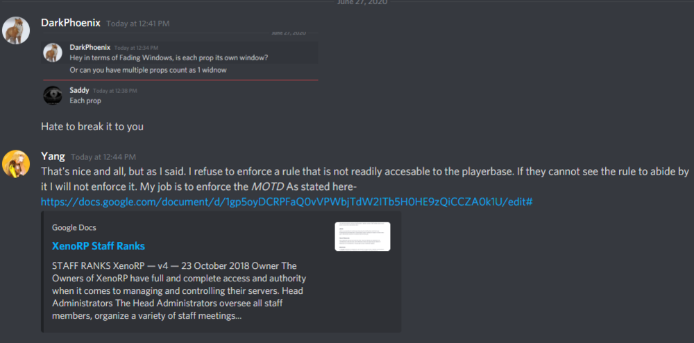 a1) What is your in-game (RP) name? Ben Stryker a2) Provide a link to your Steam profile.https://steamcommunity.com/profiles/76561198092831986/ a3) What is your Discord Tag? (ie: SomeUser#1234) DarkPhoenix#5733 a4) What timezone are you located in? PST a5) How many in-game warns do you have? 0 a6) Have you ever been banned? If so, explain why? Never once been banned from XenoRP. a7) Do you have any prior staffing experience? If so, where? My previous staffing experiences include: Senior Admin on GroxGaming, Mod on Gaminglight SchoolRP, Director of Revival Servers, Director of Adept Servers Please answer these questions with your honest opinion. b1) Why do you want to volunteer for XenoRP? I want to volunteer for Xeno because it is one of the better DarkRP servers out there. I have seen very little sits go unanswered by staff, and not many players are minges. b2) If you were to get accepted, what do you think would make you a good moderator? I think my ability to calmly deal with issues would make me a decent moderator. That, and I have a fair amount of experience staffing on servers and I grab as many sits as I can handle. Please provide descriptive answers for the following questions: c1) Define RDM/RDA and describe how players who perform those actions should be punished. RDM/RDA=Random Deathmatch/Random Arrest respectively. A player that does these things should be brought to a sit, talked to and kindly told not to do them again, and then be issued a warning for said action(s). c2) Explain "NLR" and provide examples of instances in which it is violated. NLR=New Life Rule. It is violated usually if a raid is occurring and the owner of the base is killed, but returns to defend/prop block the raiders. c3) Define "metagame" and provide examples of its occurrence. Metagaming is using OOC information to do IC actions, such as someone doing "// I have meth and weed in my house with printers" and the police responding and searching then arresting the guy. Please explain how you would handle each of these situations: d1) You see a higher up is abusing their powers to the highest severity, how do you react? I would start screenshotting and recording the abuse then report it to a person higher than them, but if I can target them in ULX, I would probably ban them after gathering my evidence. d2) During a sit, you see someone outside of the sit Mass RDMing. How do you handle the situation? If I saw someone Mass RDMing outside of a sit, I would instantly ask another staff member to get on duty and deal with it, or if I am close to conclusion of my current sit, I would quickly end the sit and bring the Mass RDMer. d3) Only two other players are online, and they're building in the streets. Rules are still rules. They cannot build on the streets. I would ask them to remove it and consult our MoTD with further questions.